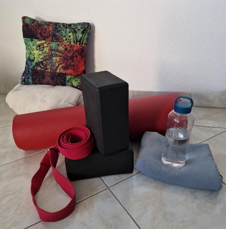 Benötigt werden: bequeme Kleidung, Gymnastikmatte, Kissen, Handtuch, Getränk, ggf. eine Decke für die entspannende Schlussphase